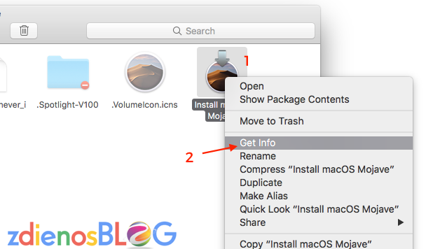 Selanjutnya biar lebih 'cantik', kita akan ganti icon harddisk menjadi icon installer Mojave juga. Caranya gampang, klik kanan file installer mojave app, klik Get Info.
